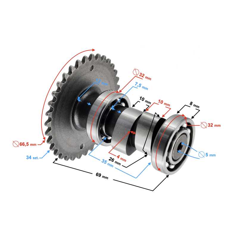 Wałek rozrządu do skutera BARTON HURAGAN 5 50 cm3,; długość całkowita wałka rozrządu: 68,9 mm; zębatka rozrządu: 34; łożyska:; - 16002- 6002